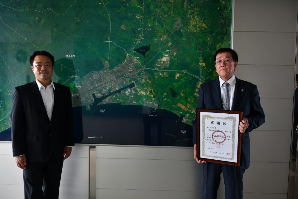 2025.09.19 お知らせ 衛星写真パネルを苫小牧市に寄贈しました 苫小牧市内全域を写した衛星写真パネルを寄贈いたしました。 パネルは、苫小牧市役所12階展望回廊に設置しており、開庁時間内であれば自由に見学できます。 8年前の苫小牧市全域のパネルも併設しておりますので、新旧見比べることができます。