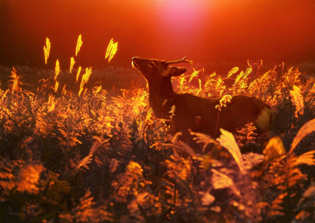 晩秋の赤みを増した夕陽の光のなかに、シルエット気味にたたずむ若いエゾシカの姿を、的確なカメラアングルで活写しました。距離感が抜群ですし、被写体を中心にはせず、わずか右にずらしていますが、あくまでも目は画面の中心線に置いています。輝くススキを周辺に入れるなど心憎い画面構成です。非常に素晴らしいセンスをお持ちです。