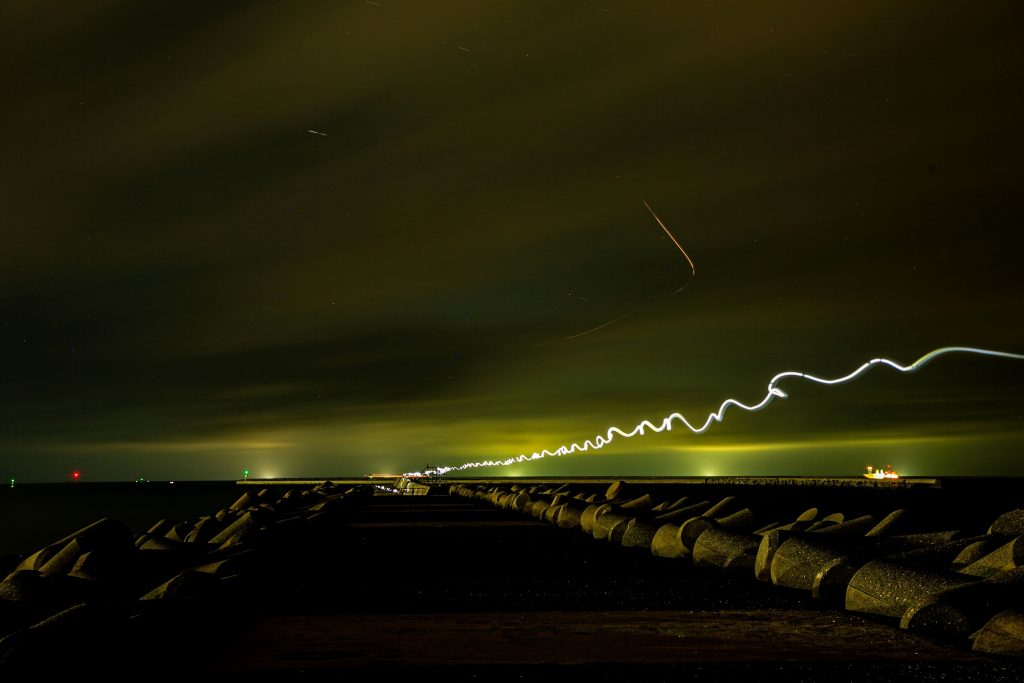 釣り人の持っている釣り竿の穂先についているケミカルライトの跡なのだと気がつきました。よくぞこのような被写体を写真にしたものです。暗い夜空には飛行機の光跡も写っていますし、長秒を生かした心憎い作品です。